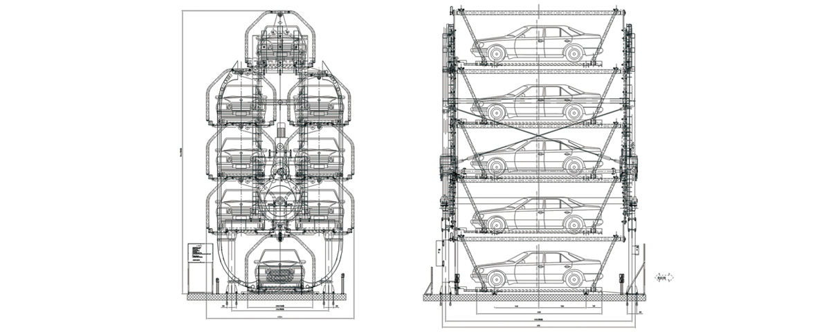 垂直循环类机械停车设备采用与地面垂直方向做循环运动达到存取车辆的目的。工作原理为通过减速电机带动传动机构,在牵引链条上每隔一定距离安装一个存车托架,存车托架随链条一起做循环运动。