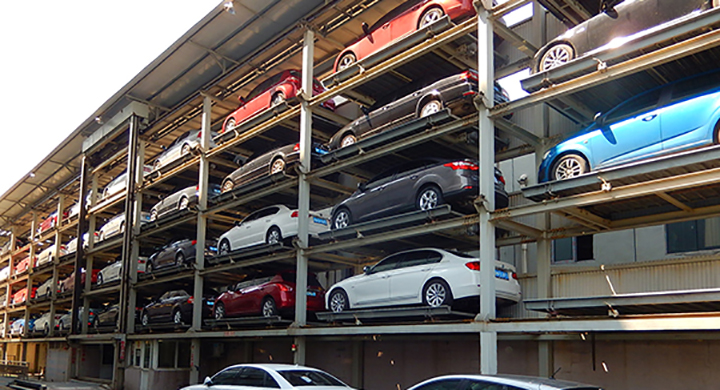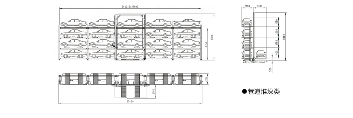 巷道堆垛类停车设备主要通过智能搬运器(堆垛机)沿轨道作三维运动:升降系统提升、道轨移动和输送机械横 向输送将所要存取车辆送到指定位置。可以单边布置也可以两边对称布置。单边平行道路巷道堆垛停车设备是充 分利用地下室狭窄空间或是地面马路旁空地来布置。